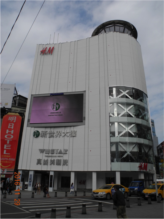 戶外LED,尺寸12m×6.72m,可視面積達80.64平方公尺。採用新開發高亮度放電管,不論白天晚上、不論晴雨,高清影像畫質,提供全天候最優質的播放效果。